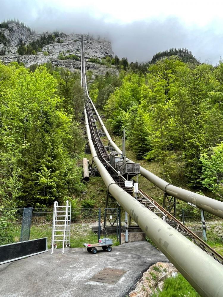 Vor dem Kraftwerk stand ein Lift aus den 1960ern der Mithilfe von Schienen zum Speichersee fährt. Man könnte aber auch die mehr als 3800 Stufen nutzen, um zum Speichersee zu gelangen. Diese Stufen wurden bisher in einer Rekordzeit von rund 30 min bewältigt. Leider durften wir den Lift und die Treppen nicht nutzen.