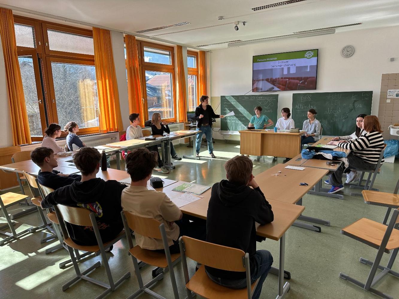 In einer simulierten Gemeindesitzung diskutierten wir Themen wie neue Bushaltestellen, einen Nightliner und die Förderung des Radverkehrs. Jede Rolle brachte eigene Interessen ein und gemeinsam suchten wir nach Lösungen. Dabei lernten wir, wie wichtig Zusammenarbeit und unterschiedliche Perspektiven für nachhaltige Entscheidungen sind und wie herausfordernd es sein kann Kompromisse und Lösungen zu finden.