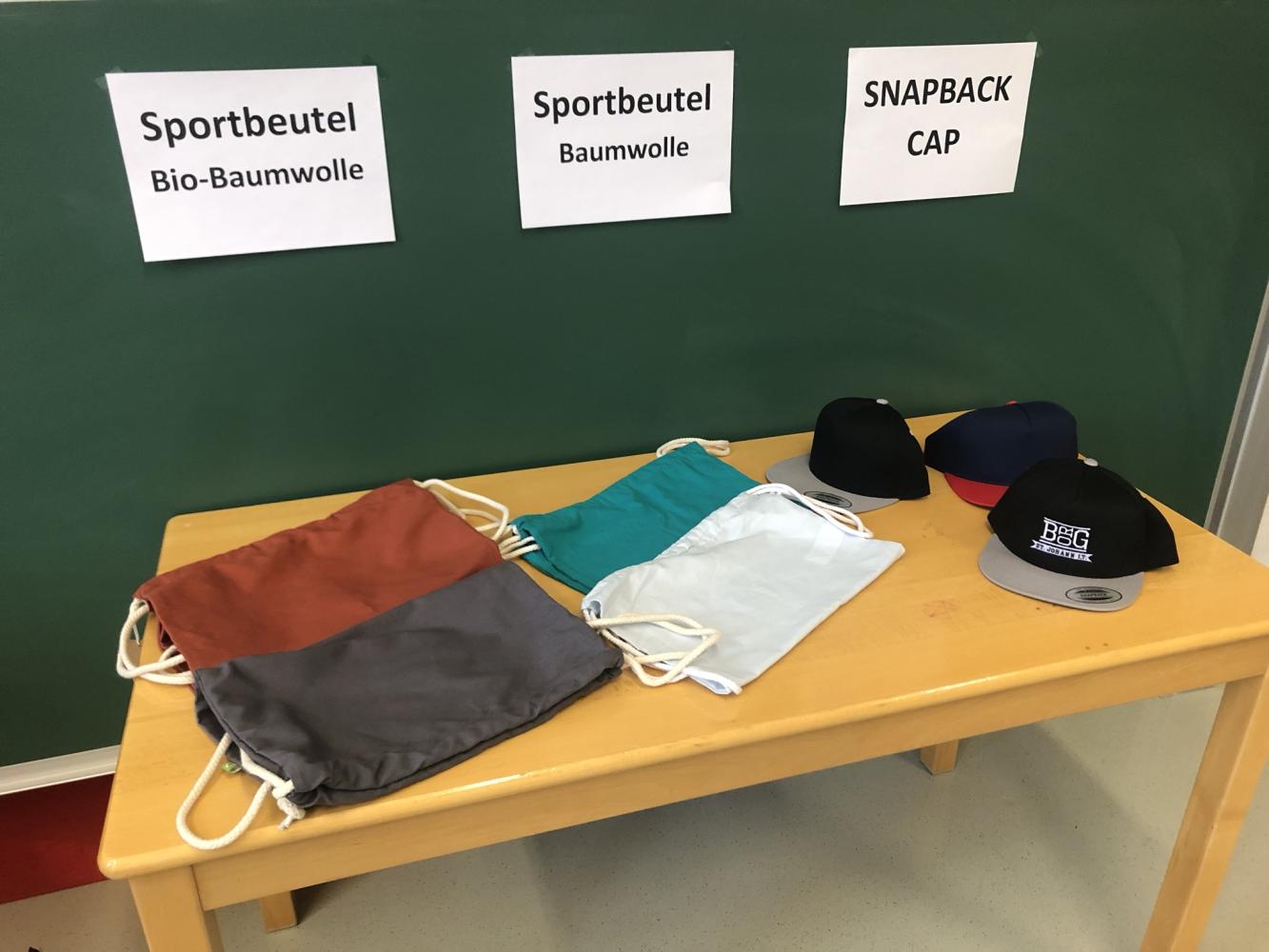 Das Angebot reicht von T-Shirts und Polos über Sweater bis zu Hoodies und Jacken in unterschiedlichen Farben. Die Sportbeutel sind in Baumwolle und Bio-Baumwolle erhältlich. Die Snapback Caps haben ein gesticktes Schullogo. Genauere Informationen sind an der Pinnwand vor der Aula im 1. Stock oder auf Moodle zu finden.